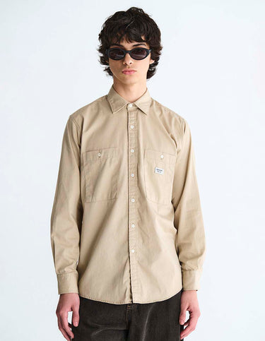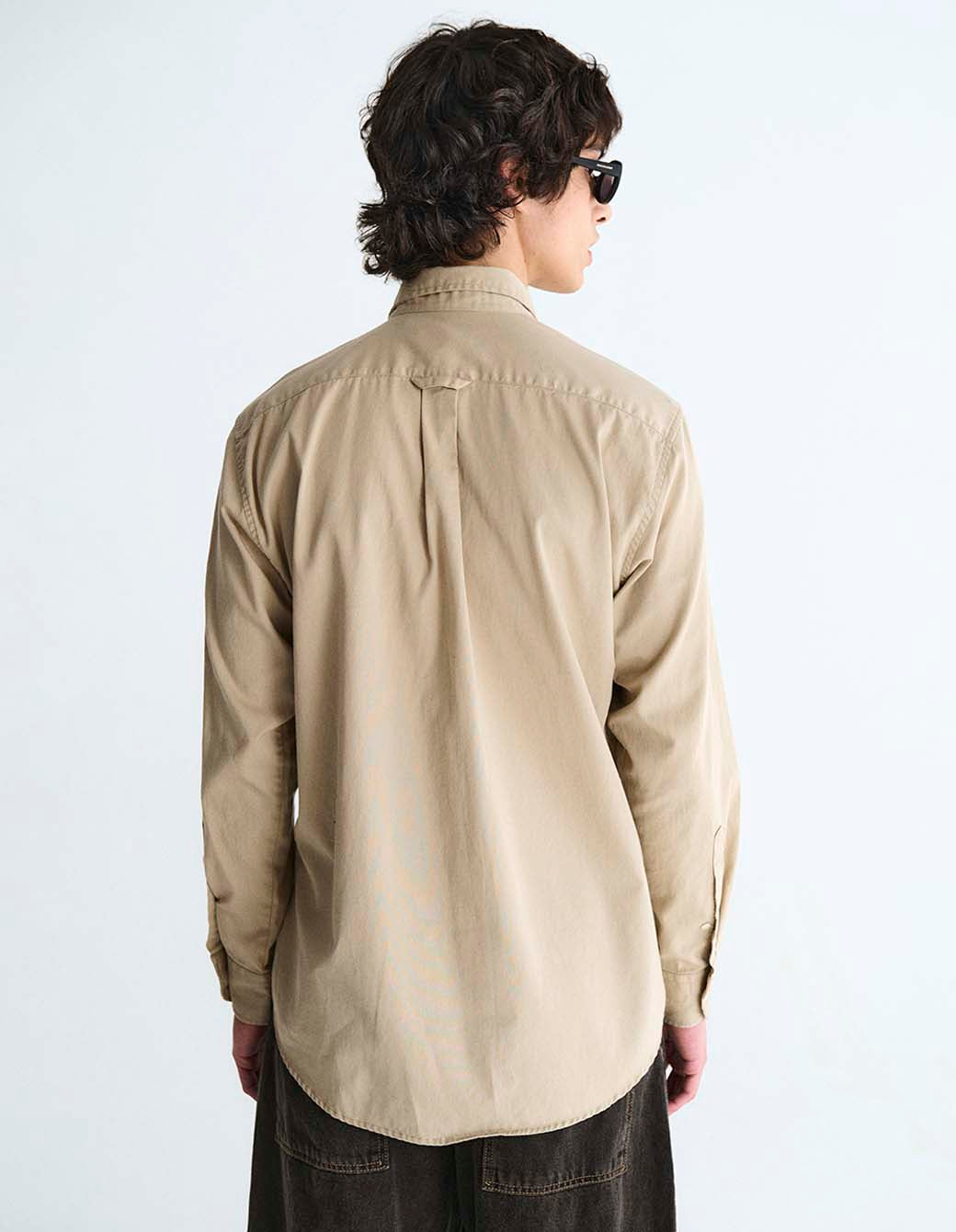 Camisa m/l de gabardina teñida con botones de pasta personalizados y doble bolsillo delantero. Lavado desgaste parejo.