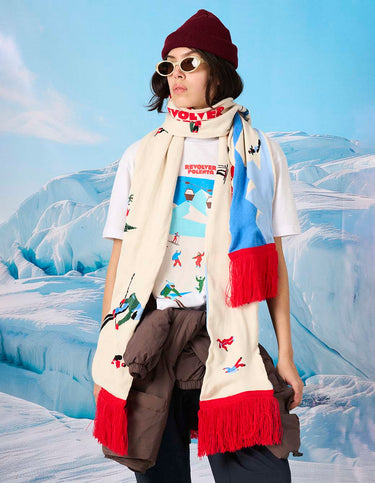 Bufanda doble faz de 2m de largo con flecos de 20cm, tejida en jaquard con arte exclusivo. Edición Limitada Polenta x Revolver.