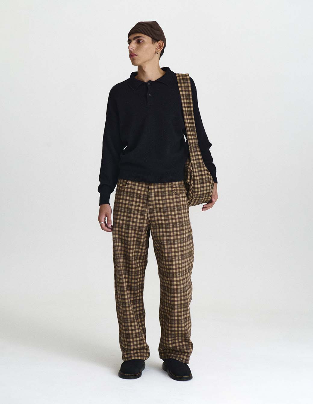 Pantalón 5 bolsillos en sarga sastrera de algodón a cuadros de calce amplio.