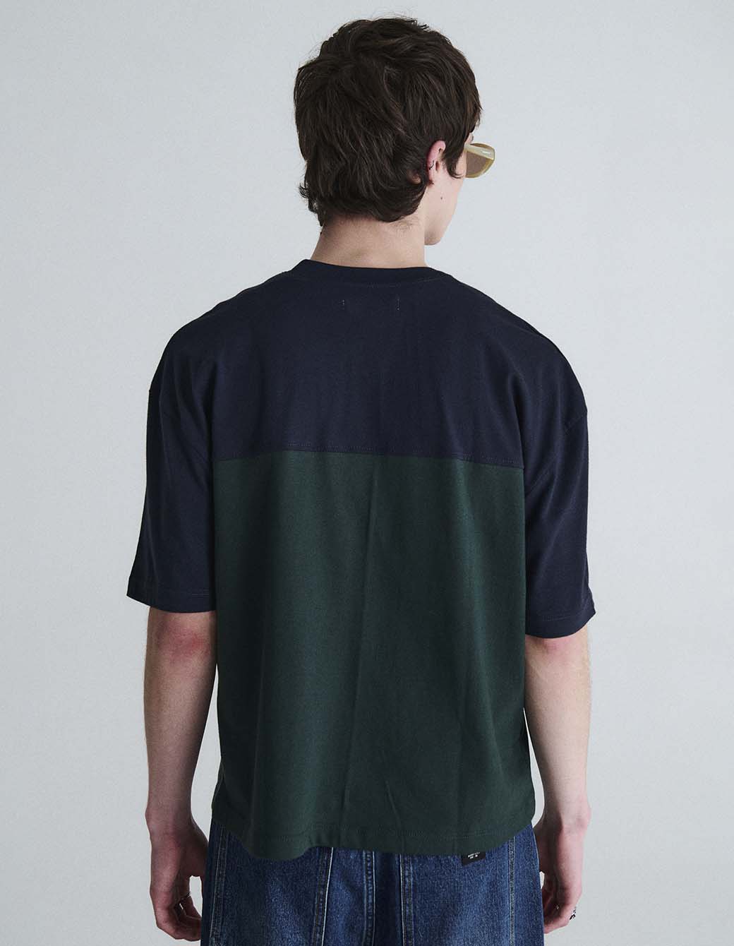Remera m/c cuello redondo de calce amplio regular en jersey combinado, con estampa frontal personalizada .
