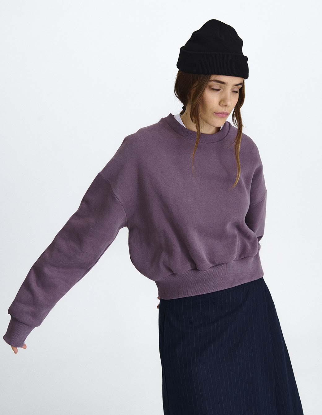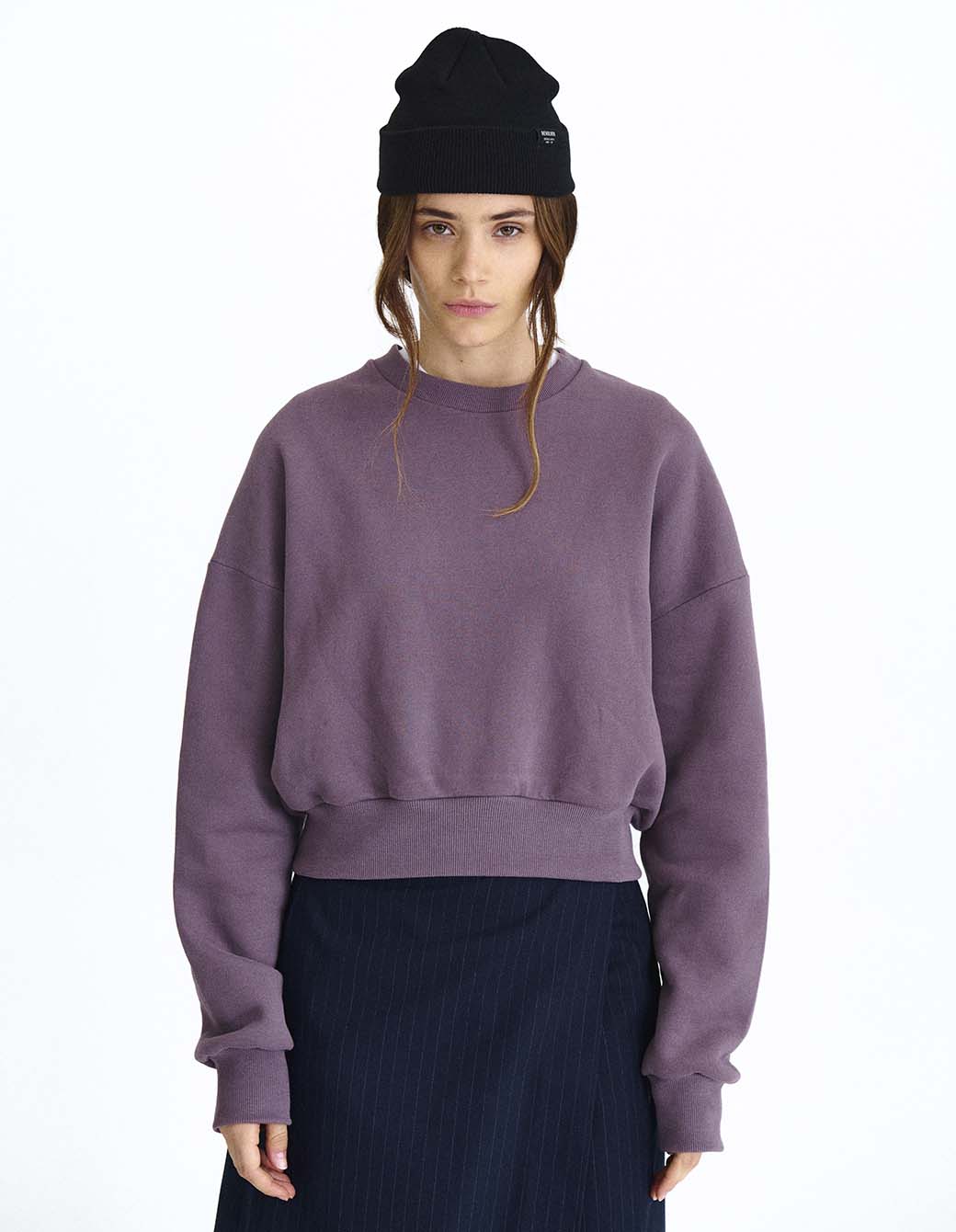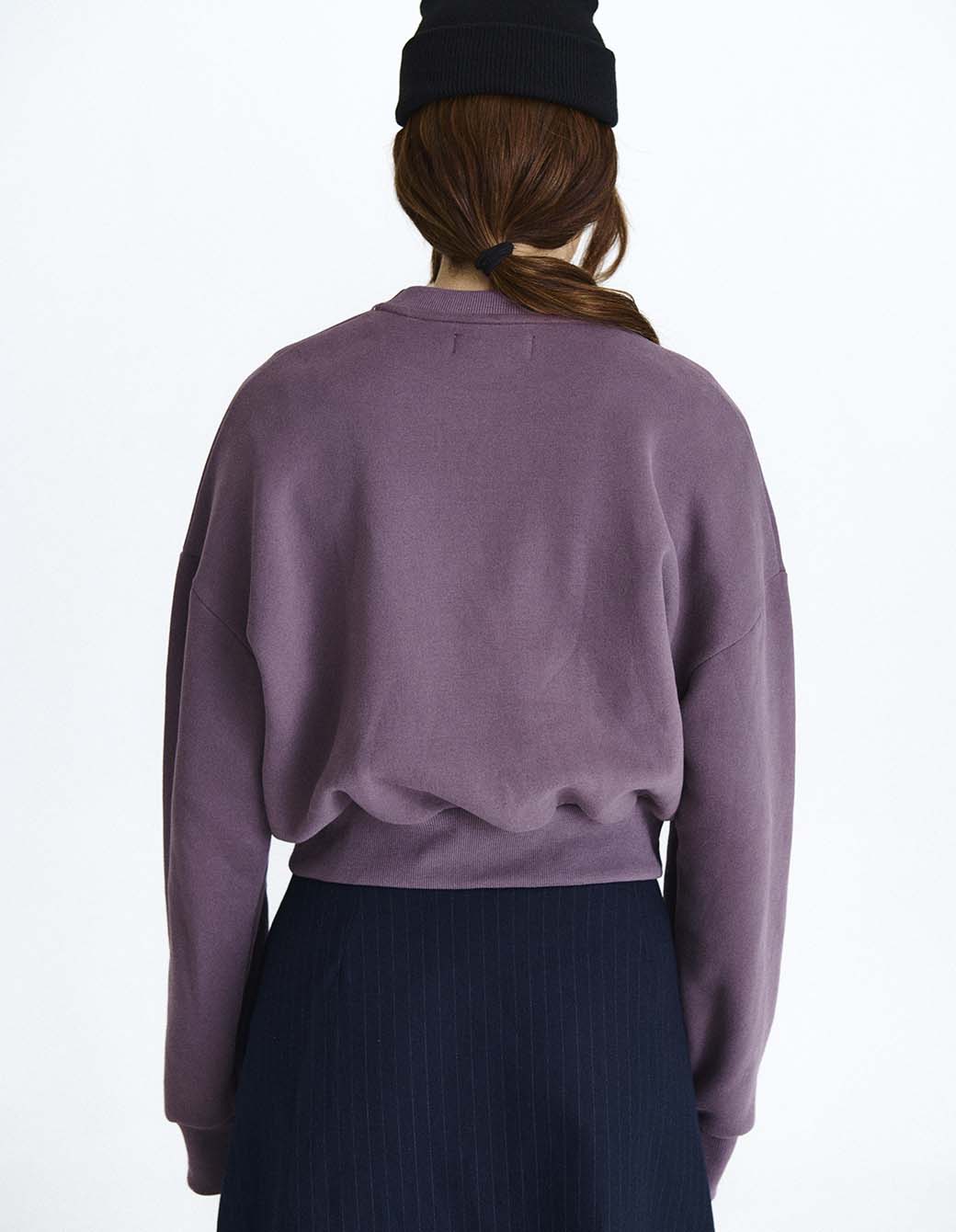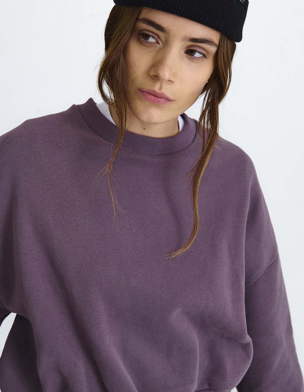 Buzo cuello redondo de calce crop en frisa pesada con bordado frontal.