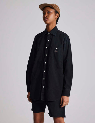 Camisa m/l de gabardina con botones de pasta personalizados y doble bolsillo delantero. Lavado desgaste parejo.