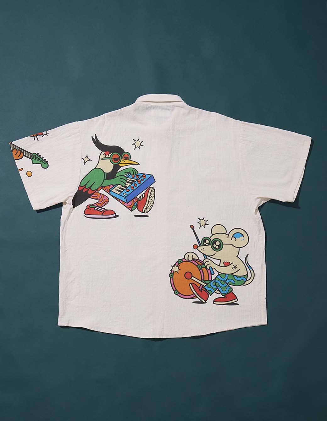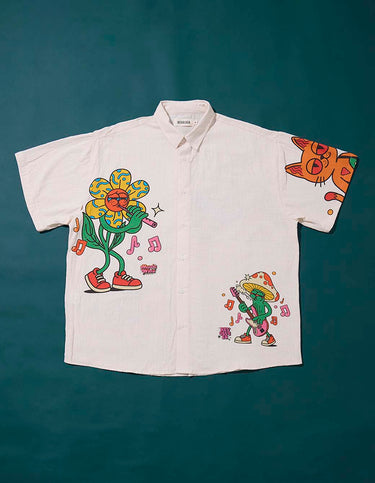 Camisa M/C de algodón con textura levemente arrugada, botones de pasta y estampas en frente y espalda.