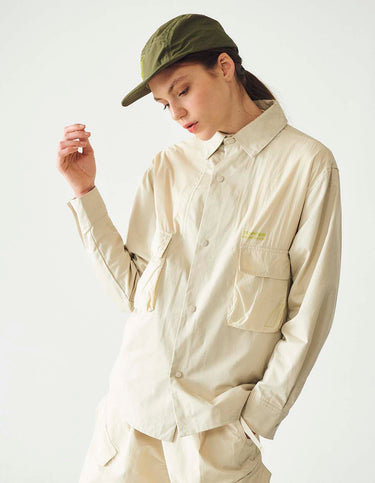 Camisaco manga larga con cuello ingles y canesú, combinado en dos telas base. Bolsillos plaque con tapa en el frente. Snaps metálicos para acceso. Arte transfer en el frente e isologo en espalda. Estampa interna. Avíos de marca personalizados.