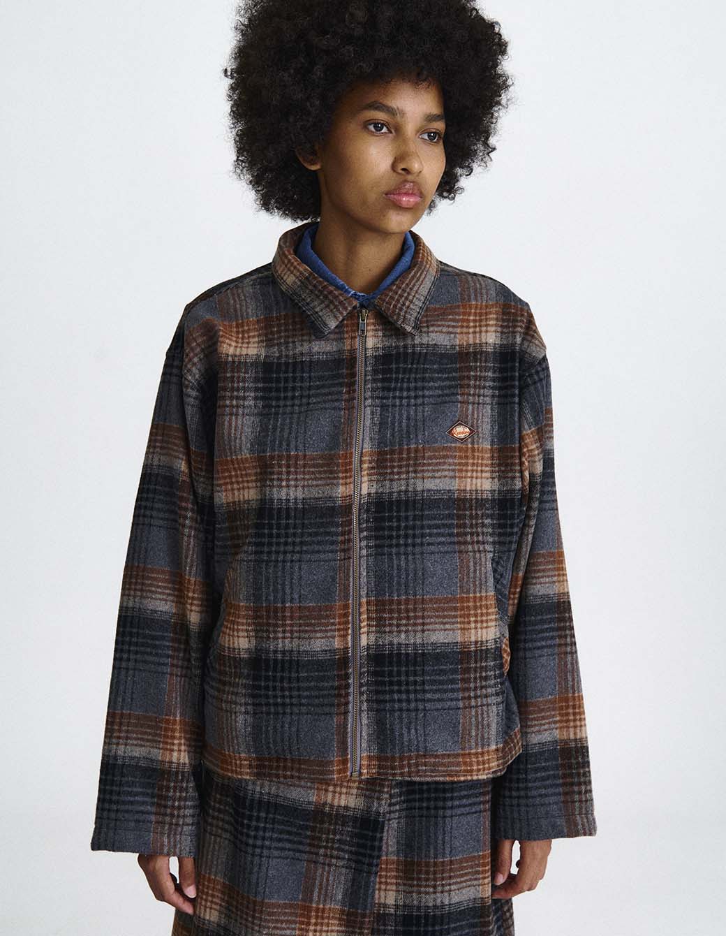 Campera de paño a cuadros de calce regular con acceso en cierre metálico y bolsillos diagonales delanteros con etiqueta personalizada frontal. Interior con costuras envivadas.