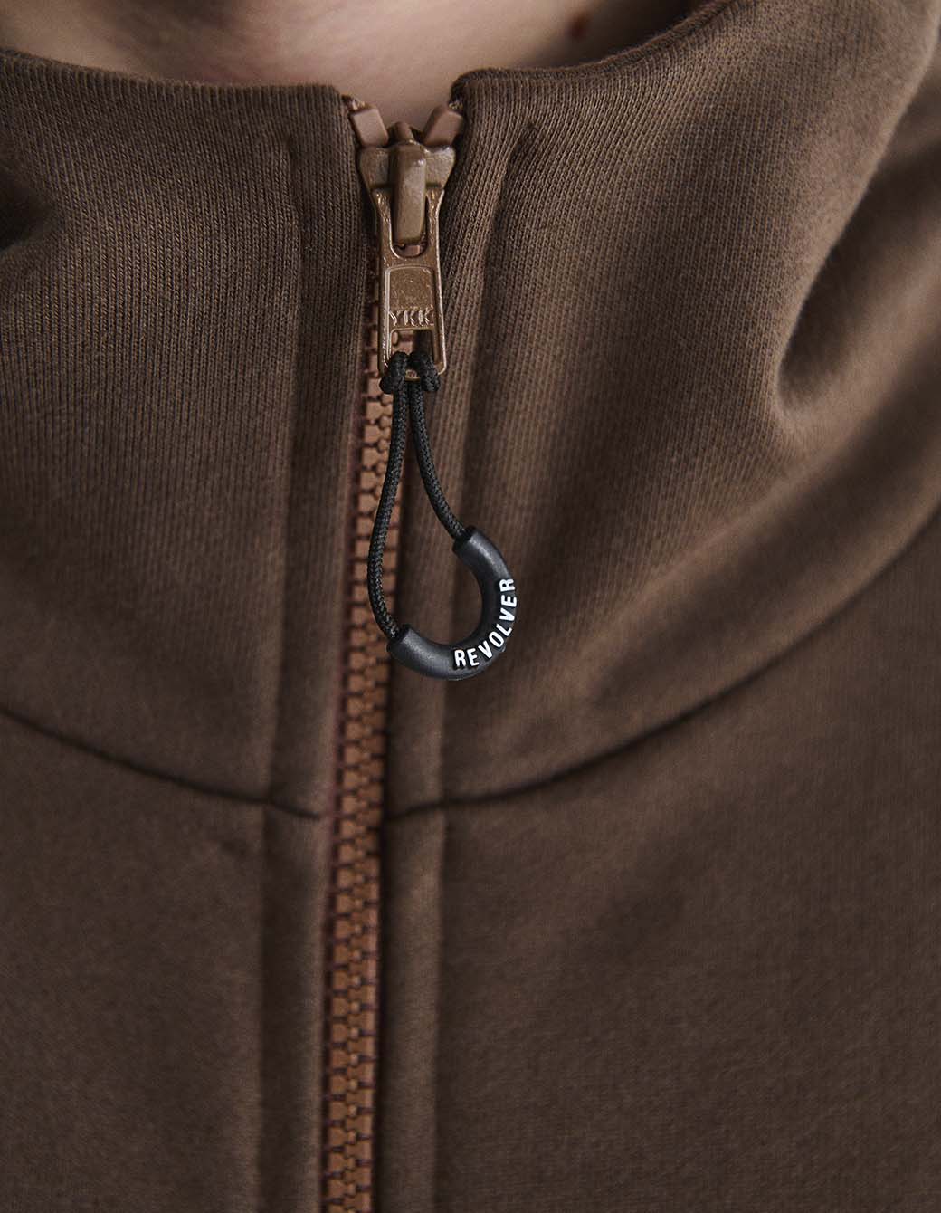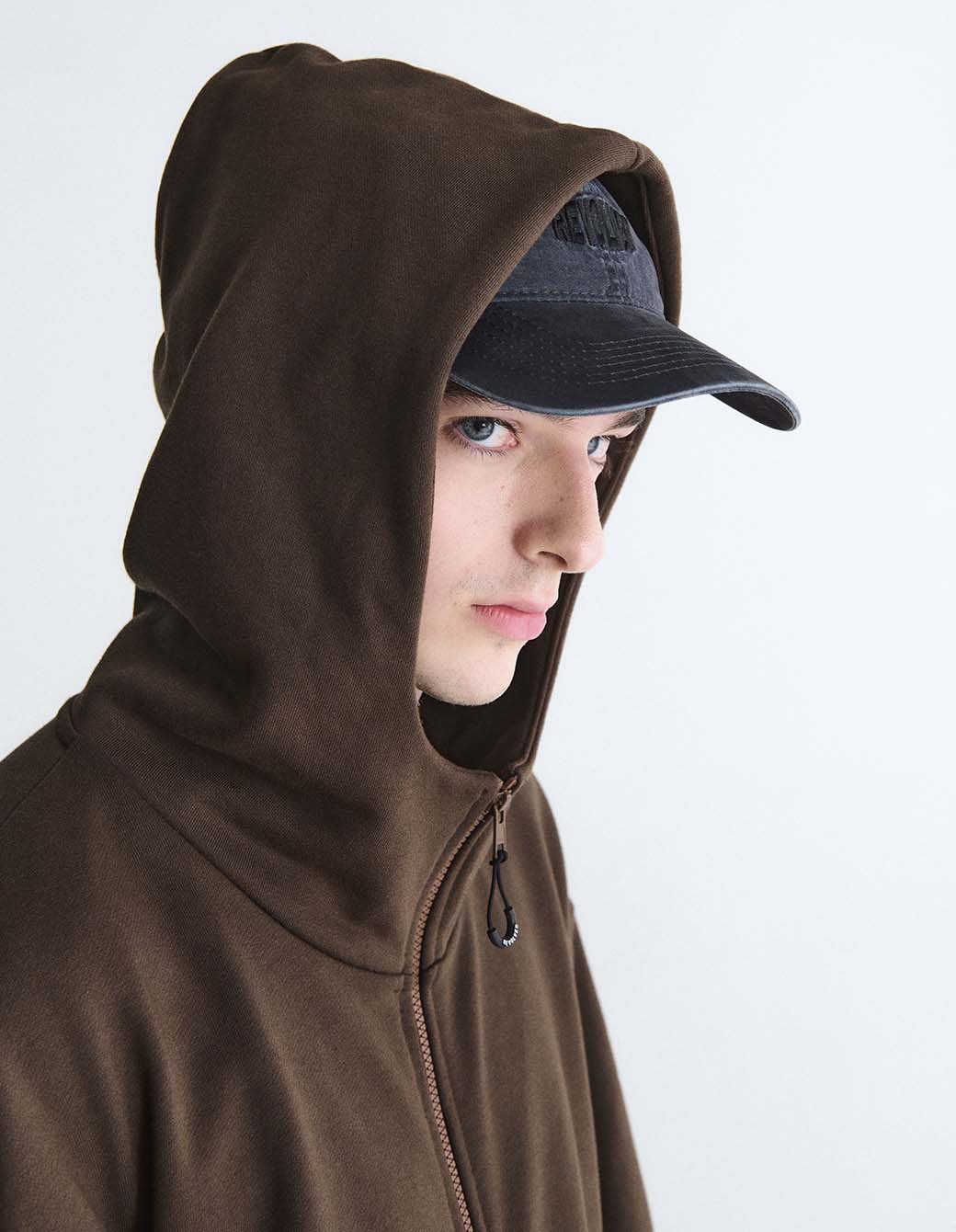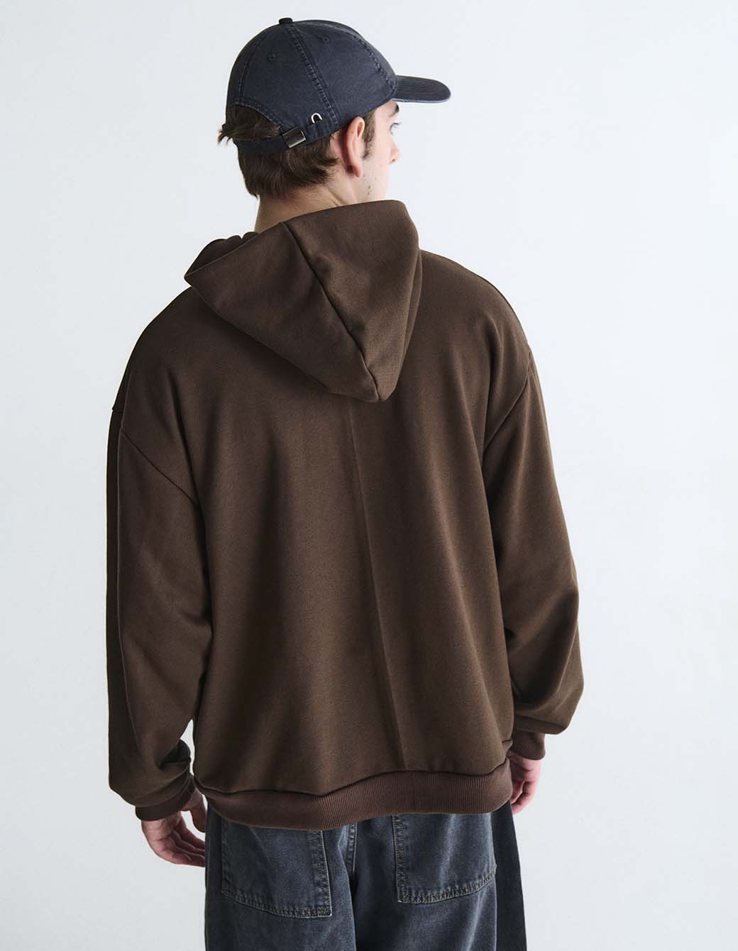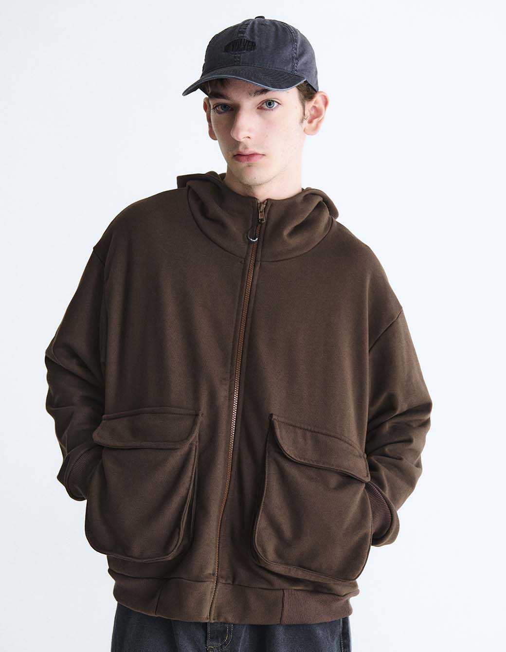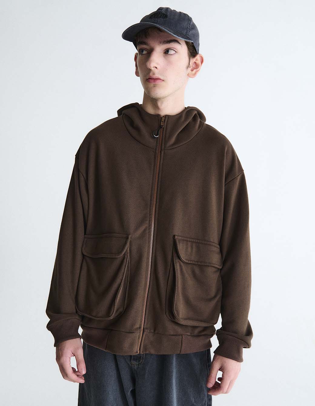 Campera en rustico pesado con capucha y cierre frontal, con bolsillo con tapa y fuelle de doble ingreso. Tiracierre personalizado.