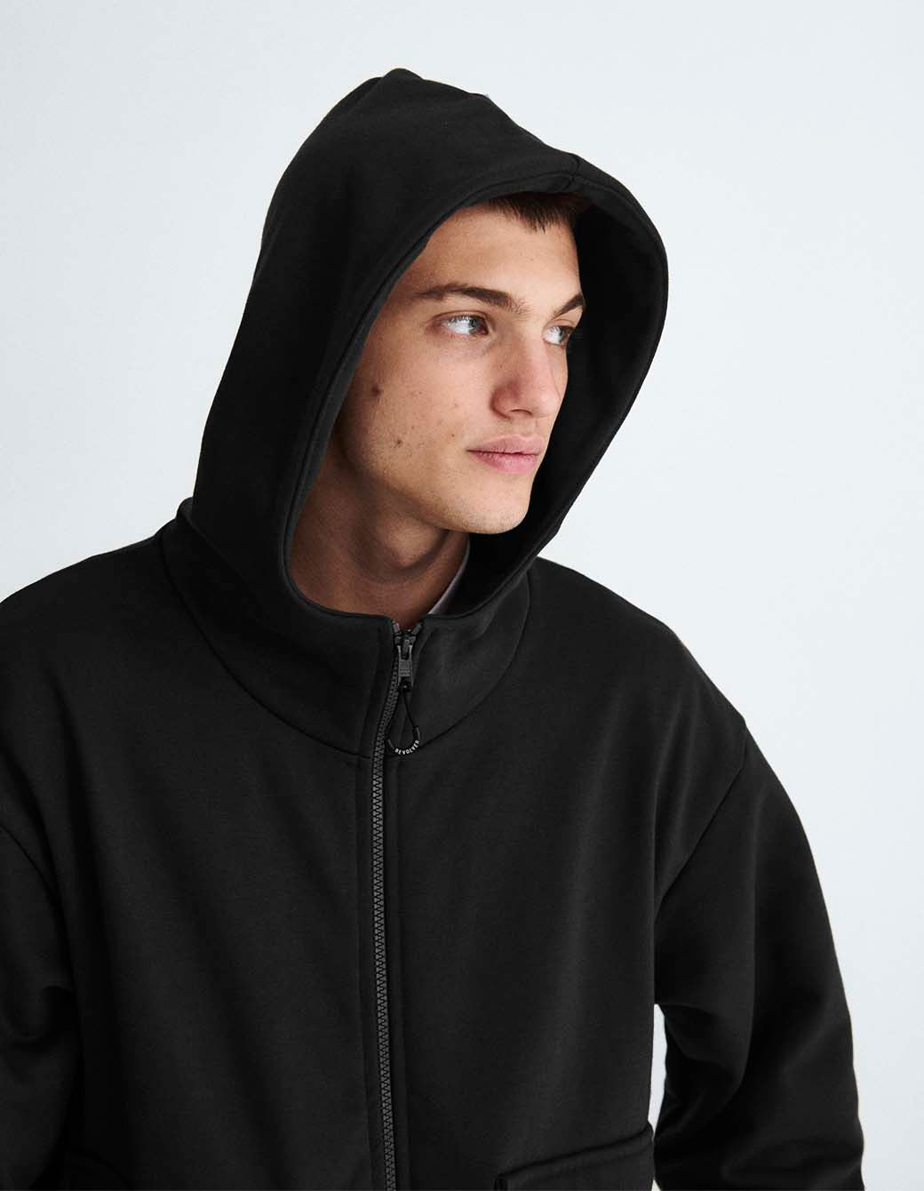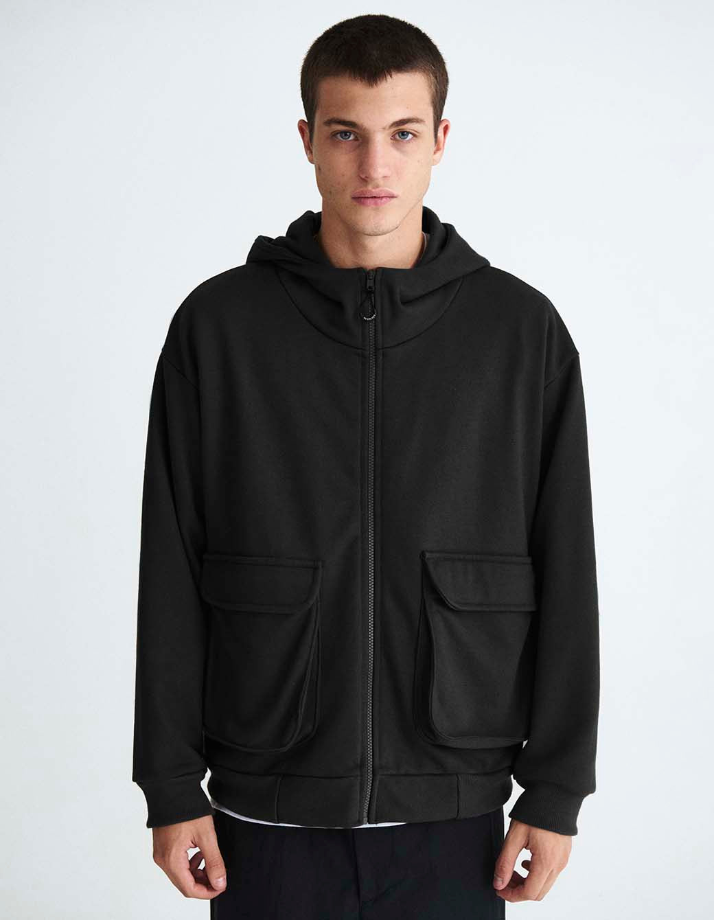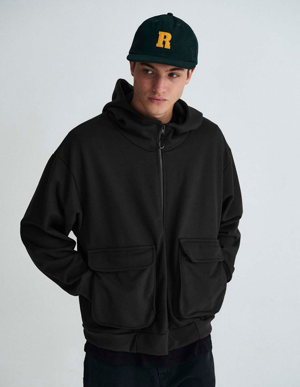 Campera en rustico pesado con capucha y cierre frontal, con bolsillo con tapa y fuelle de doble ingreso. Tiracierre personalizado.