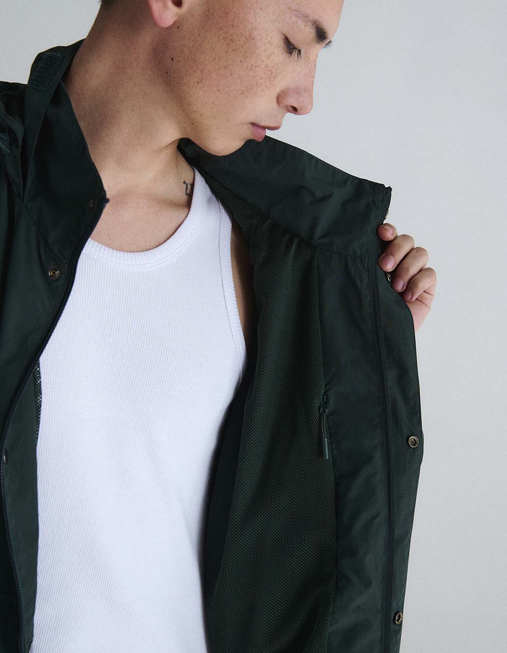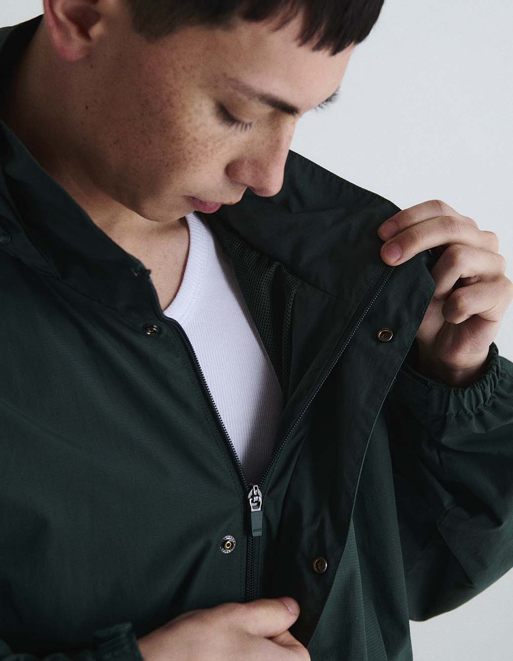 Campera técnica con capucha, acceso con cierre oculto con pestaña con broches. Bolsillones con fuelle y tapa. Reguladores en velcro para puños y cordón elástico con tancas en cintura y capucha. Forrada con mesh.