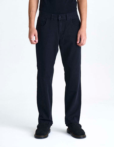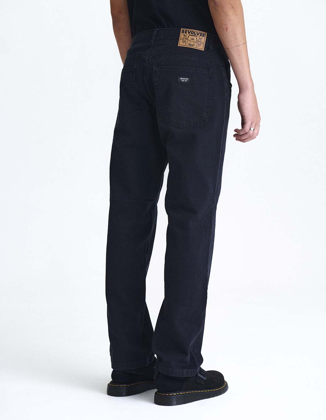 Jean de bull 5 bolsillos de calce amplio con botón y remache metálico, badana JL y etiqueta bordada en bolsillo trasero. Lavado desgaste parejo.