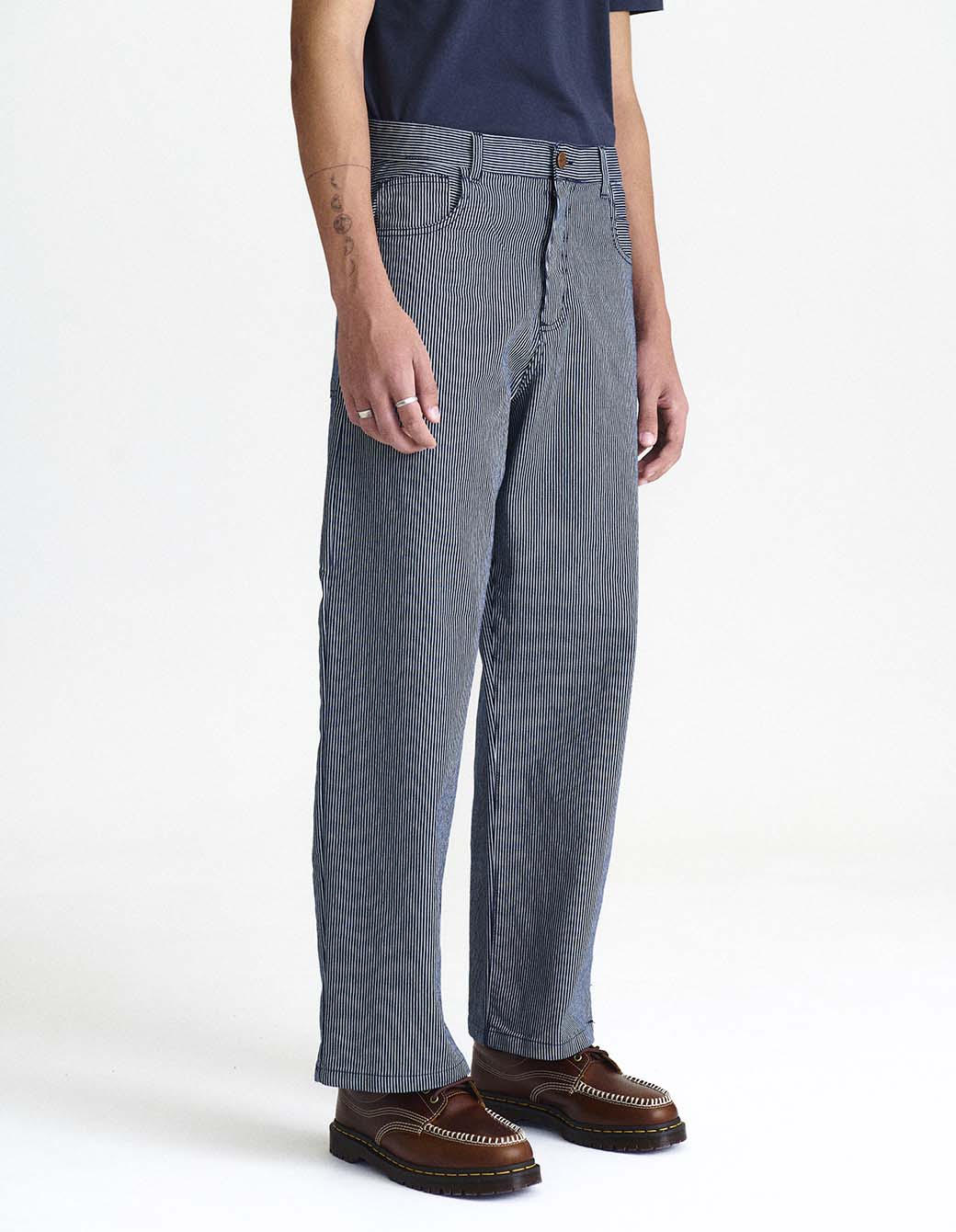 Jean de denim rayado 5 bolsillos de calce amplio con botón y remache metálico, badana JL y etiqueta bordada en bolsillo trasero. Lavado suavizado.